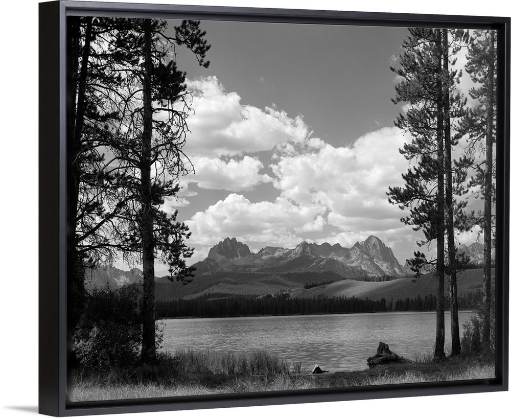 <p>1960's Little Red Fish Lake In Idaho With Saw Tooth Mountains In Background Viewed Between Clearing In Trees.</p>