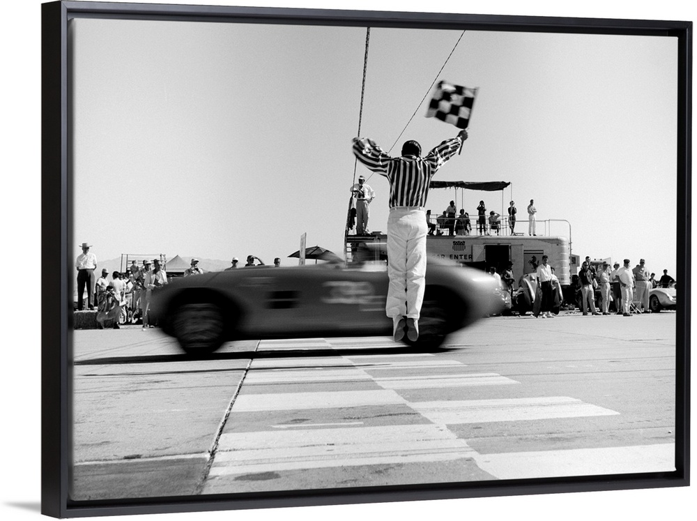 <p>1960's Man Jumping Waving Checkered Flag For Winning Sports Car Crossing The Finish Line.</p>