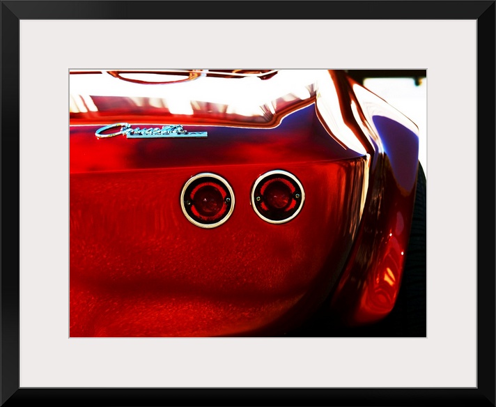 <p>Photograph of the rear and break lights of a red 1963 Corvette Stingray 15.</p>
