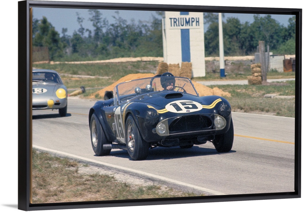 <p>Dan Gurney takes a Shelby Cobra through the Webster Turn at the 1963 Sebring Race.</p>