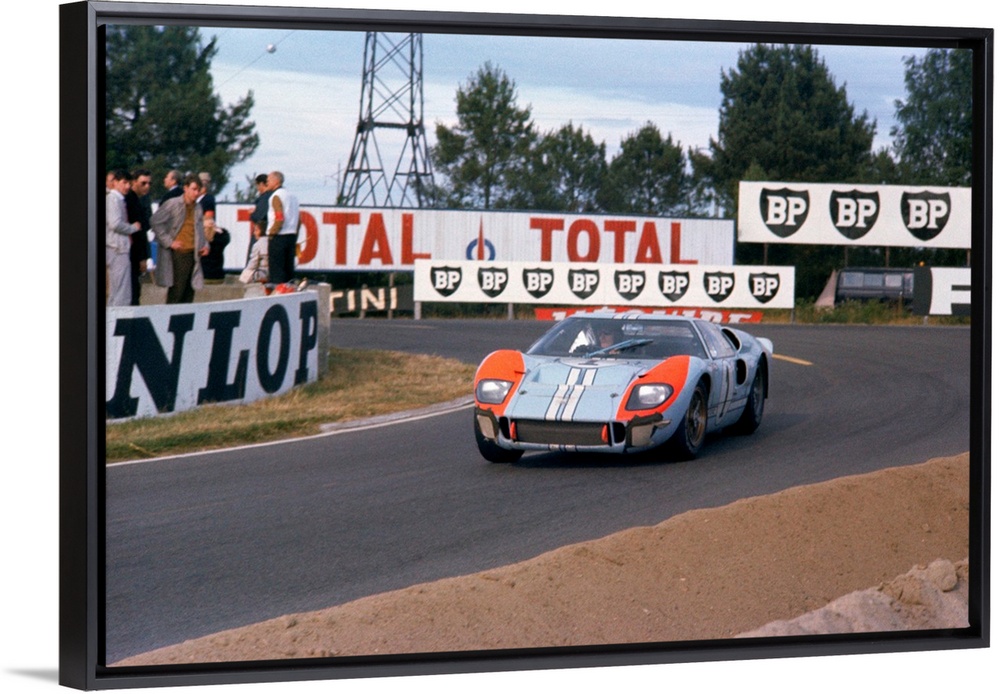 <p>Ken Miles and Denis Hulme driving their Ford Mark II at the Mulsanne Hairpin at the 1966 LeMans Race.</p>