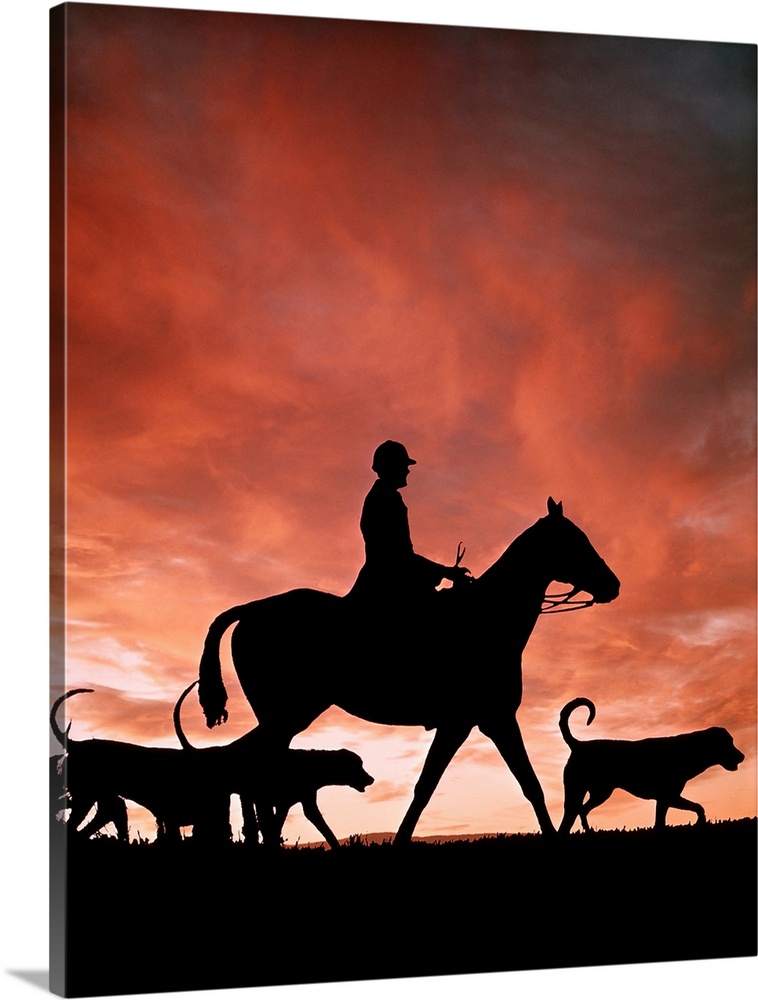 <p>1970s Silhouetted Anonymous Man Riding Horseback With Foxhound Dogs On Fox Hunt.</p>