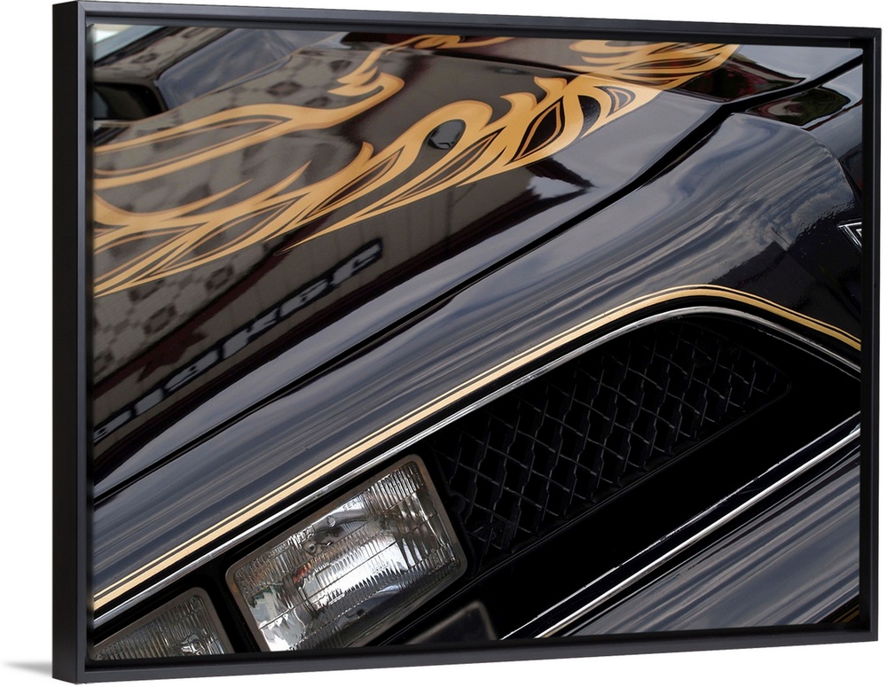 <p>Angled photograph of the front of a black and gold 1978 Pontiac Trans Am.</p>