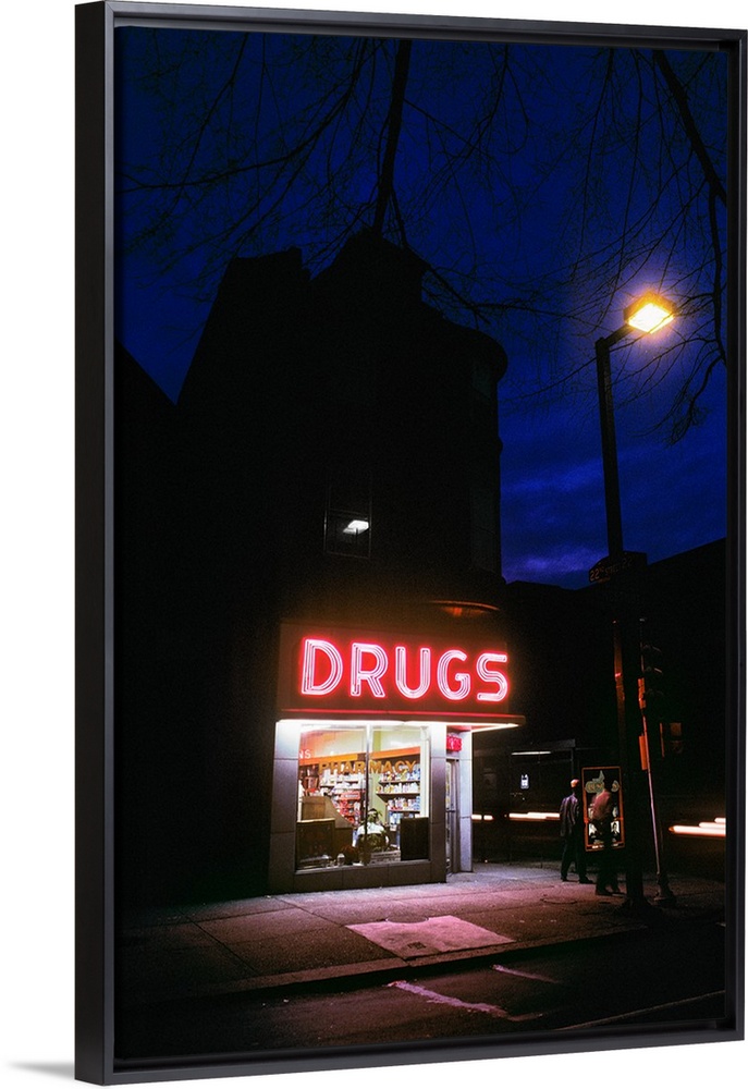 <p>1980's 24 Hour Drug Store At Night Pink Neon Sign Drugs.</p>