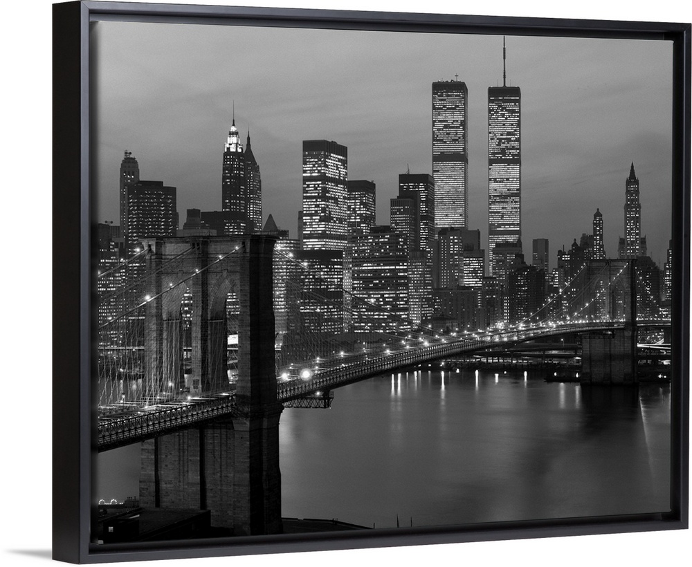 <p>1980's New York City Lower Manhattan Skyline Brooklyn Bridge World Trade Center.</p>