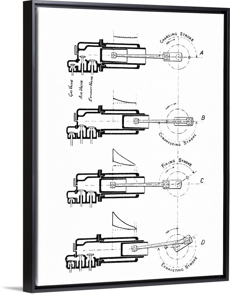 <p>19th Century internal combustion engine. Historical artwork showing the workings of a four-stroke gasoline-powered internal combustion engine, designed by the German inventor Nikolaus Otto (1832-1891). Published in 1896.</p>