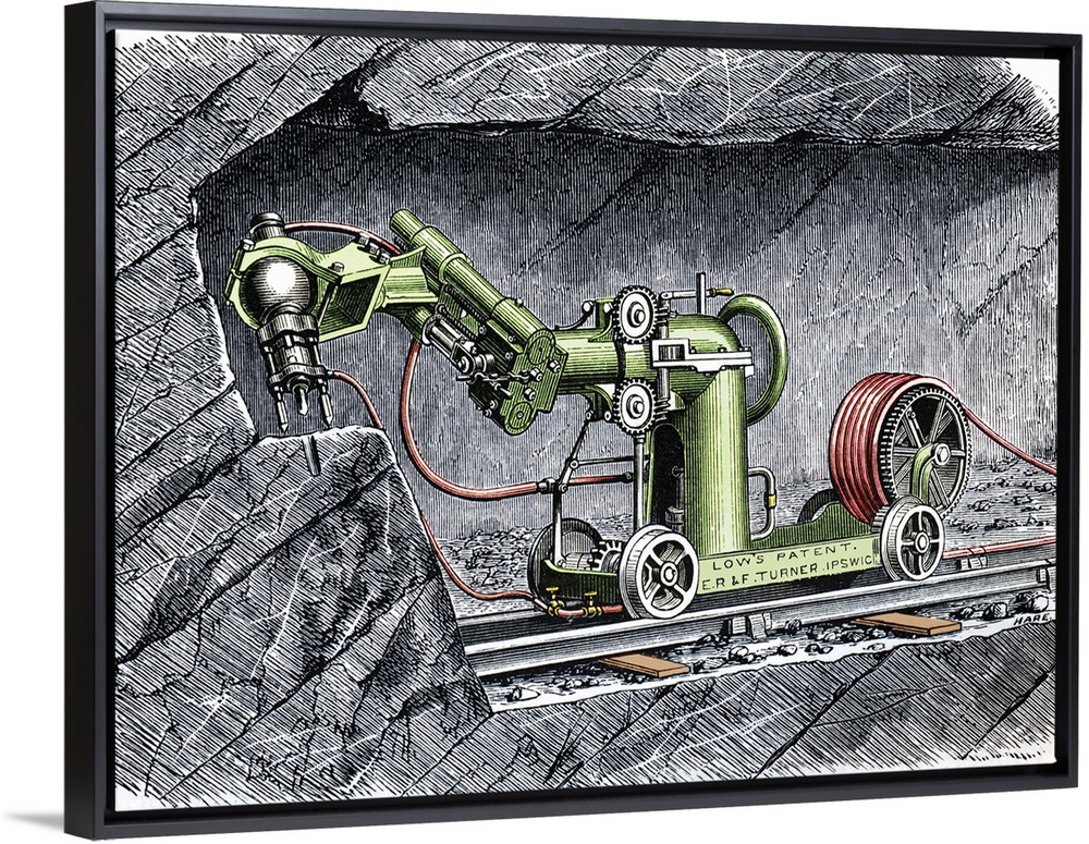 <p>19th-century mining machine. Artwork of the rock- boring machine invented and patented by George Low and manufactured by E. R. and F. Turner of Ipswich, England. The machine is powered by a pneumatic system (red hose) that can used compressed steam or air. The compressor can be located at some distance, and the machine moved to the workface on rails. The boring cylinder rotates rapidly and also moves up and down, striking the rock at a rate of 300-500 blows per minute. The boring point is around 5 centimetres across. The compressed air that powers the machine also cushions the boring cylinder, and a jet of water is used to wash away the broken rock. Artwork from Mines and Miners (L. Simonin, 1868).</p>