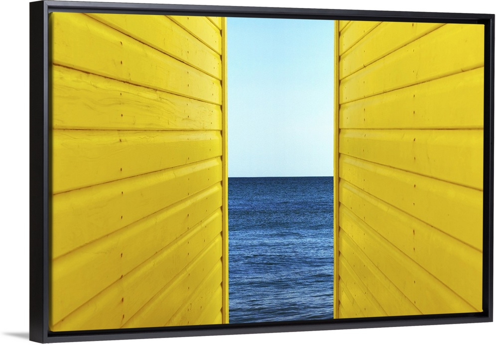 <p>Symetrical perspective of 2 Yellow Beach Huts with blue sky and sea inbetween them.</p>