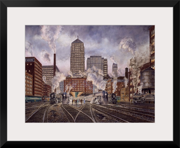 <p>Contemporary painting of a rail road yard with converging tracks and numerous trains getting ready.</p>