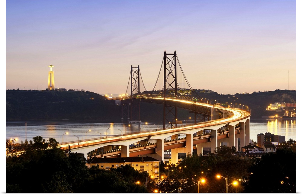 <p>25 de April bridge (similar to the Golden Gate bridge) across the Tagus river and Cristo Rei (Christ the King) on the south bank of the river, in the evening. Lisbon, Portugal.</p>
