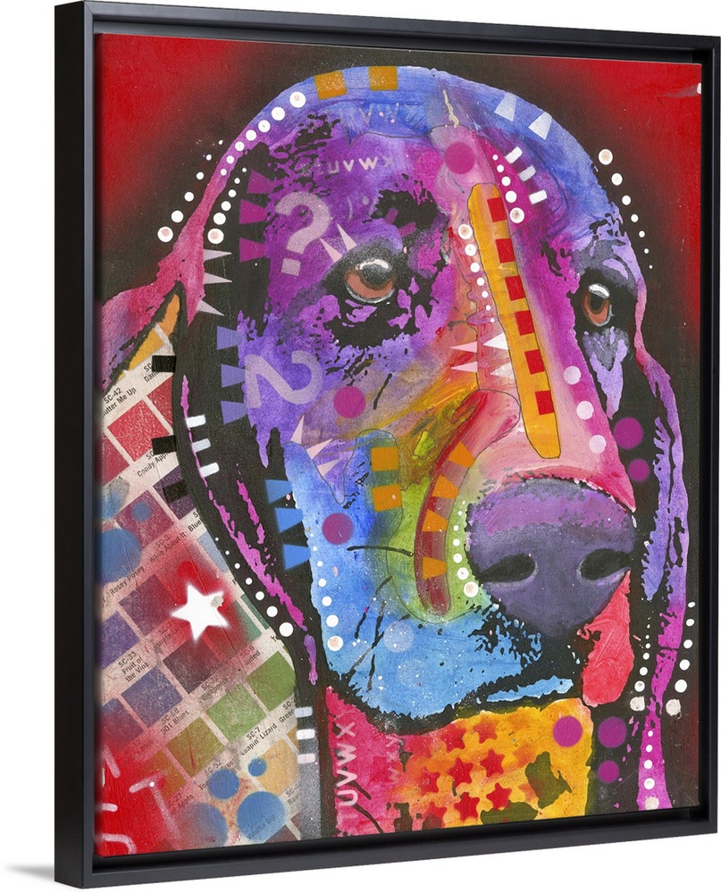 <p>Contemporary painting of a colorful Hound dog with geometric abstract designs all over on a red background.</p>