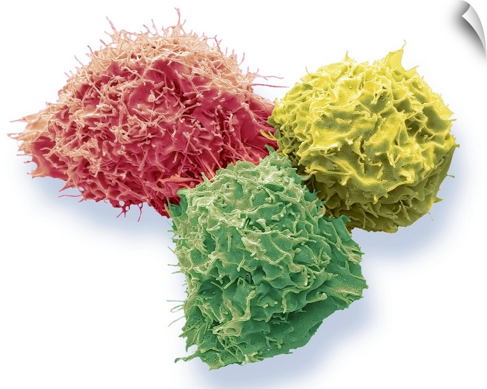 <p>293T cells in culture, coloured scanning electron micrograph (SEM). These cells were isolated from human embryonic kidneys in 1977 and have been growing in culture ever since. 293T cells have lost the capacity to defend themselves from viral infection, a capability in which all cells normally excel. 293T express several viral proteins that switch cellular defences off allowing researchers to introduce DNA into them and to use the cells to make large amounts of protein, or even infectious viruses. This makes these cells an extraordinarily valuable tool in medicine and research. People performing gene therapy use 293T to make very high doses of virus containing therapeutic genes and these are the only cells that can do this. Magnification x 3000 when printed at 10cm wide. Specimen courtesy of Greg Towers, UCL.</p>