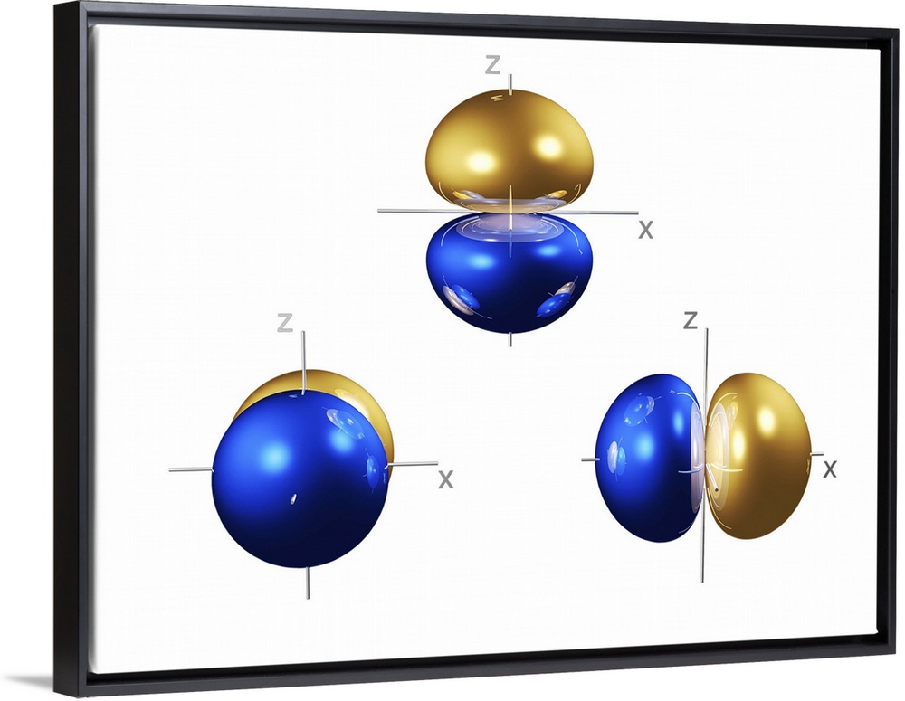 <p>2p electron orbitals, computer model. An electron orbital is a region around an atomic nucleus (not seen) in which one or a pair of electrons is most likely to exist. The three 2p orbitals have a bi- lobed shape centred on the nucleus. They are part of the 2 shell, which also contains a spherical, lower energy 2s orbital. In atoms, electrons fill the lower energy orbitals first. The 2s orbital is only filled when the lowest energy 1s orbital is full, and the 2p orbitals only when both 1s and 2s are full. The 1s and 2s orbitals can both hold a pair of electrons each, as can each 2p orbital. The 2p orbitals are thus full in element 10, neon. Neon's electron configuration is written 1s2 2s2 2p6.</p>