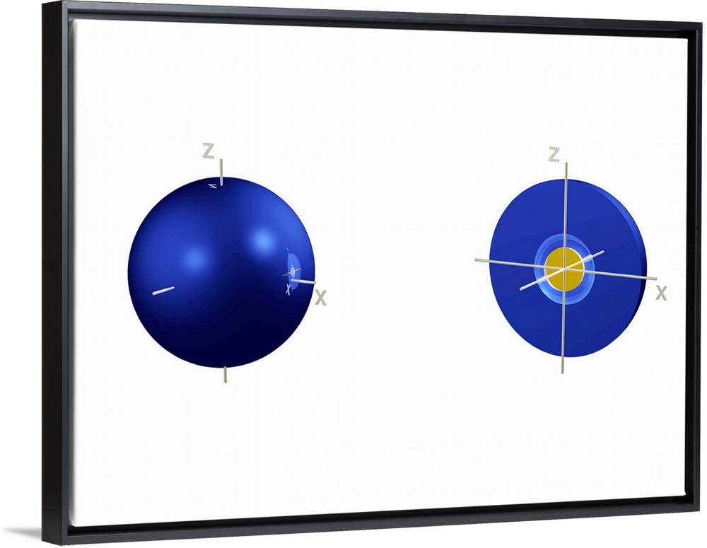 <p>2s electron orbital, computer model. An electron orbital is a region around an atomic nucleus (not seen) in which one or a pair of electrons is most likely to exist. The orbital is seen halved at right to show the spherical node contained within it. The blue area is where the wave function of the electron has a positive value, and the gold area is where it is negative. The 2 shell contains this 2s orbital and three 2p orbitals (not seen) at a slightly higher energy level.</p>