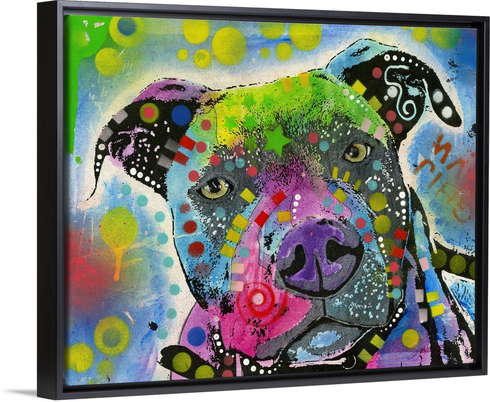 <p>Graffiti style painting of a Pit Bull with different colors and abstract designs all over.</p>
