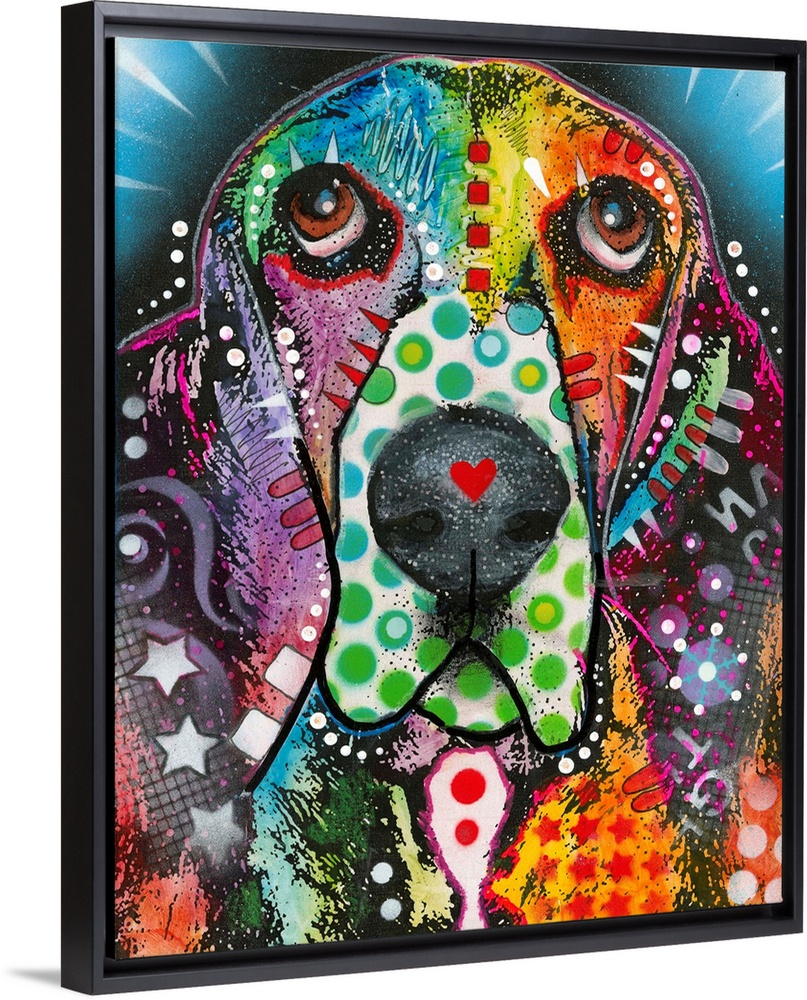 <p>Graffiti style painting of a Hound Dog with different colors and abstract designs all over.</p>