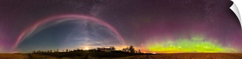 <p>360 degree panorama of a colorful auroral arc over the Canadian countryside.</p>