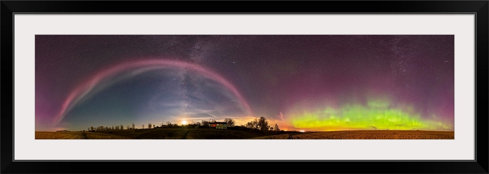 <p>360 degree panorama of a colorful auroral arc over the Canadian countryside.</p>