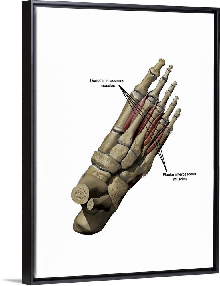 <p>3D model of the foot depicting the dorsal deep muscles and bone structures.</p>