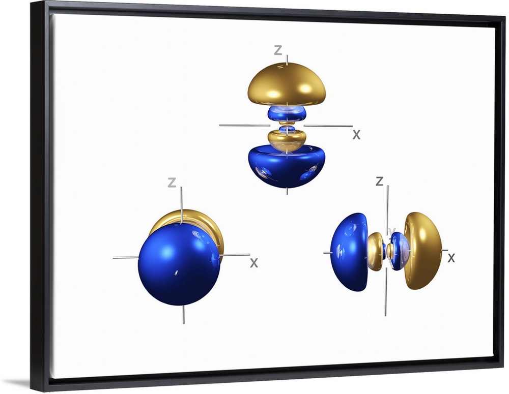 <p>4p electron orbitals, computer model. An electron orbital is a region around an atomic nucleus (not seen) in which one or a pair of electrons is most likely to exist. The three 4p orbitals are each made up of six lobes, three pairs centred on the nucleus that decrease in size towards it. They are part of the 4 shell, which also contains a spherical 4s orbital at lower energy, and five 4d orbitals and seven 4f orbitals at a higher energy (not seen).</p>