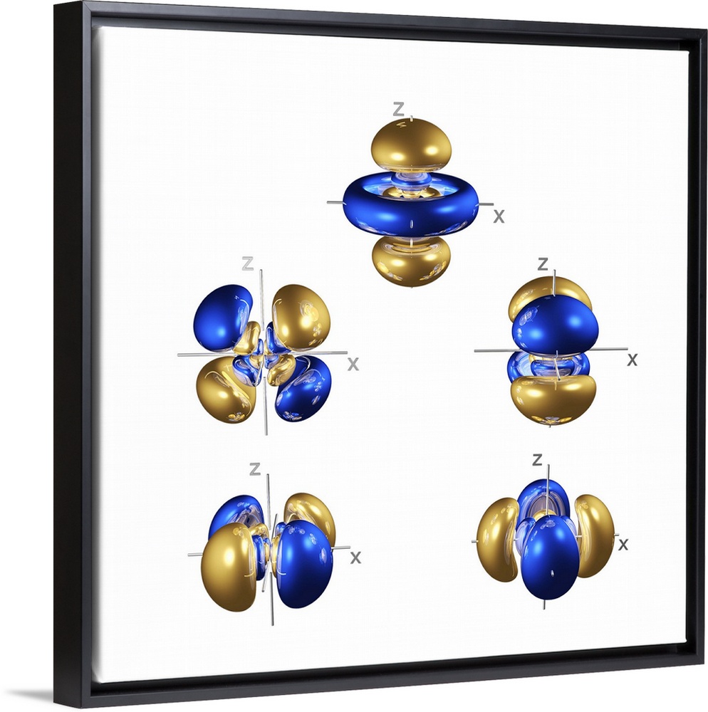<p>5d electron orbitals, computer model. An electron orbital is a region around an atomic nucleus (not seen) in which one or a pair of electrons is most likely to exist. Four of the five 5d orbitals are made up of four tri-lobed lobes, centred on the nucleus. The orbital at top comprises two tri- lobed lobes with a concentric pair of equatorial rings. The 5 shell also contains one spherical 5s orbital and three lobed 5p orbitals, both at a lower energy, and seven lobed 5f orbitals at a higher energy level (not seen). The 5d shells are partially full in the third row of transition metals, which typically form coloured compounds as electron transitions between 5d orbitals absorb some visible wavelengths of light.</p>