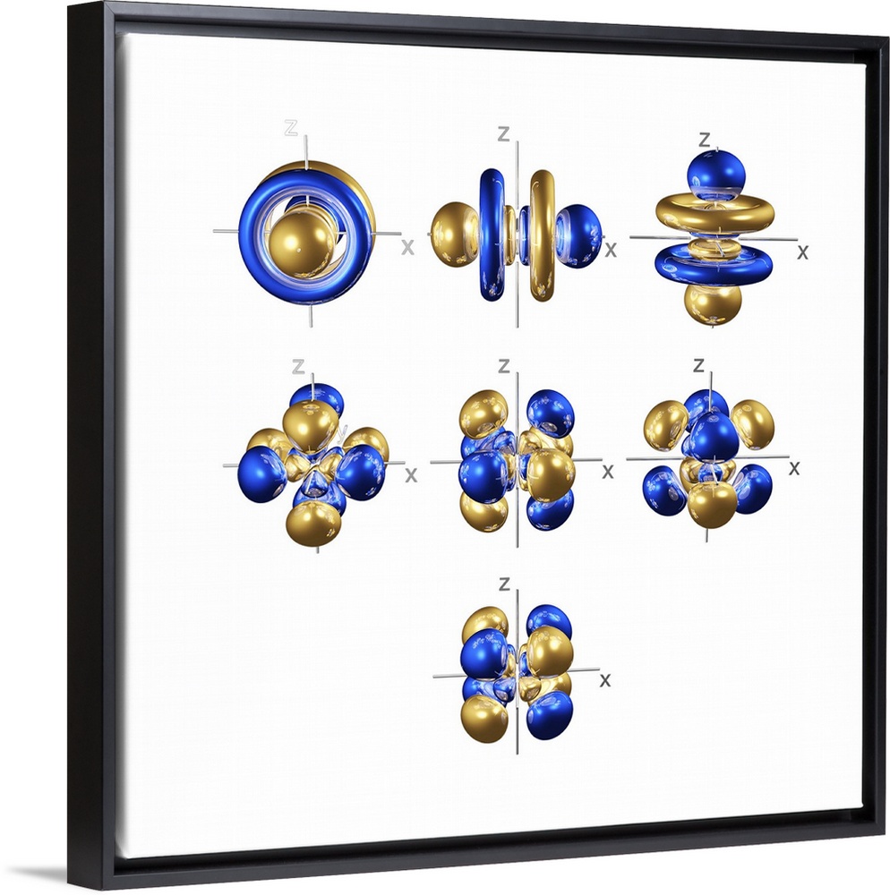 <p>5f electron orbitals, cubic set, computer model. An electron orbital is a region around an atomic nucleus (not seen) in which one or a pair of electrons is most likely to exist. The 5f orbitals are unusual in that there are two ways to represent the orbital shapes. In the cubic set, the bottom four orbitals are eight-lobed. The three upper orbitals have lobes with encircling cones. The general set is shown in image A152/151. The 5f orbitals are partially filled in the Actinide metals.</p>
