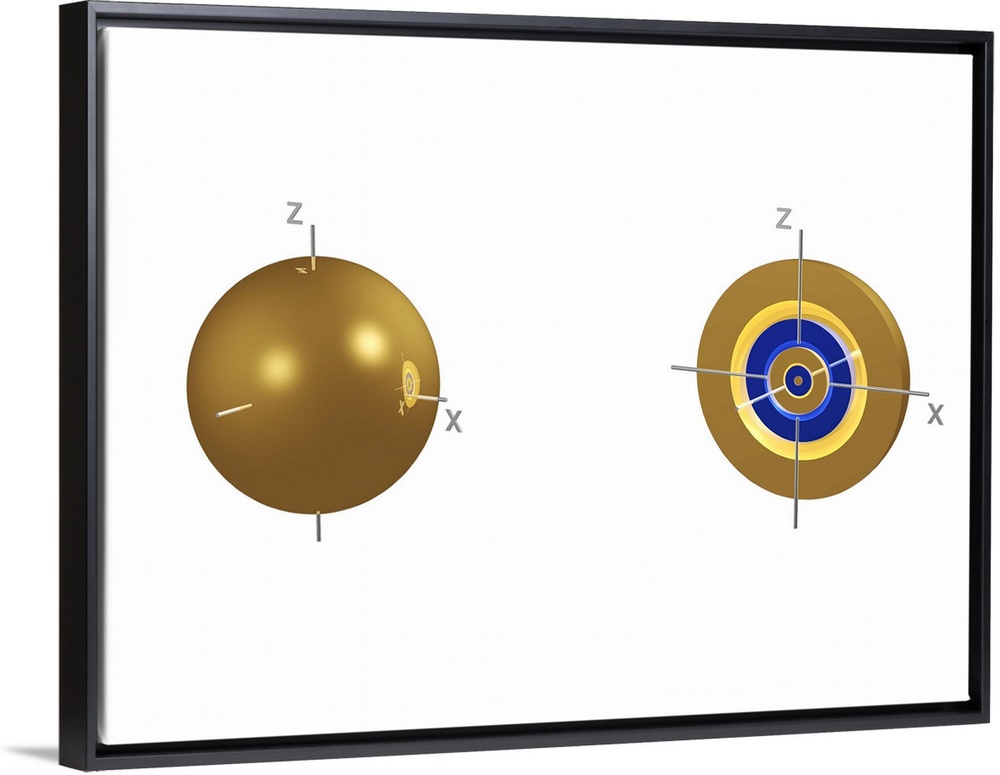 <p>5s electron orbital, computer model. An electron orbital is a region around an atomic nucleus (not seen) in which one or a pair of electrons is most likely to exist. The orbital is seen halved at right to show the concentric spherical nodes within the orbital. Gold areas are where the wave function of the electron has a positive value, and blue areas where it has a negative value. The 5s orbital has the lowest energy of the orbitals in the 5 shell, which also includes three 5p orbitals, five 5p orbitals and seven 5f orbitals.</p>