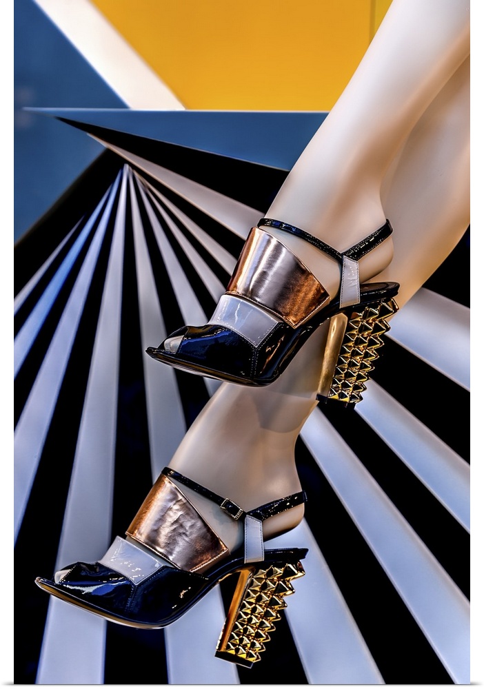 <p>High end designer shoes over a striped black and white background.</p>