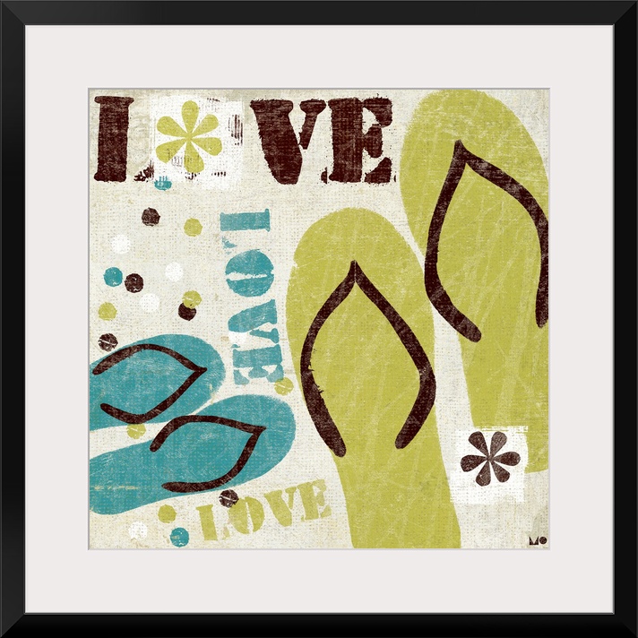 <p>Flip flops and retro flowers are painted onto a neutral background with the word love scattered about.</p>