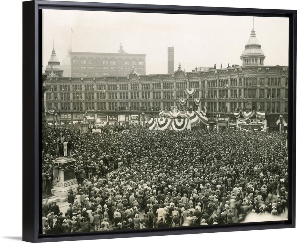 <p>75,000 cheer Wendell Willkie at Field Monument Circle, in Indianapolis, Indiana. Oct. 29, 1940. It was one of the Republican Presidential candidate's the greatest campaign receptions.</p>