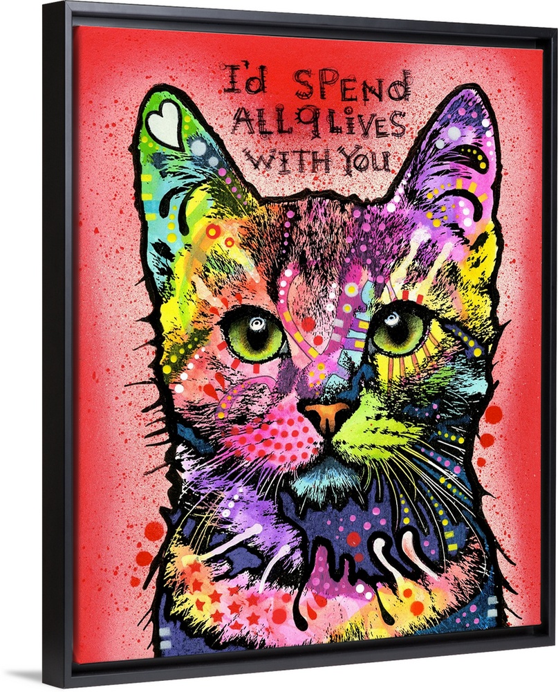 <p>"I'd Spend All 9 Lives With You" handwritten above a colorful painting of a cat with graffiti-like markings on a red spray painted background.</p>