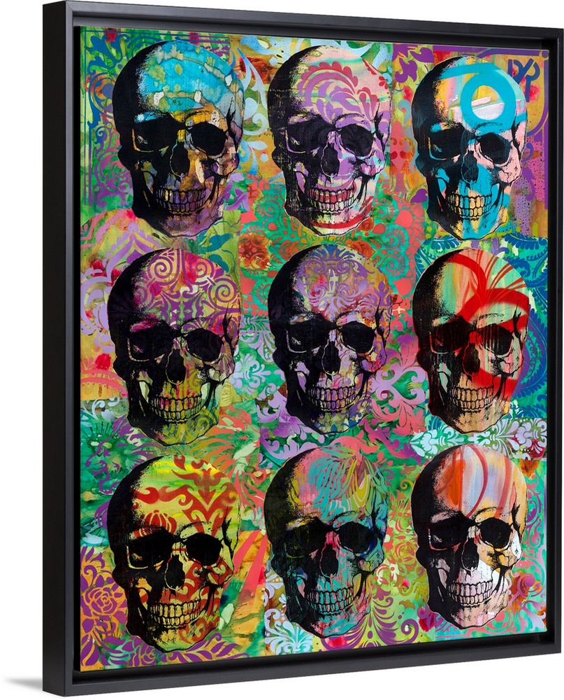 <p>9 skulls in three rows with colorful abstract designs all over.</p>