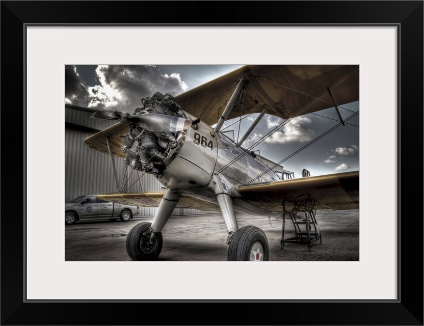 <p>A HDR photograph of a vintage air craft parked on the tarmac outside a hanger and a sky full of large cumulous clouds. The airplane is a Stearman Bi Plane found at the Arizona wing of the Commemorative Air Force Museum in Arizona</p>