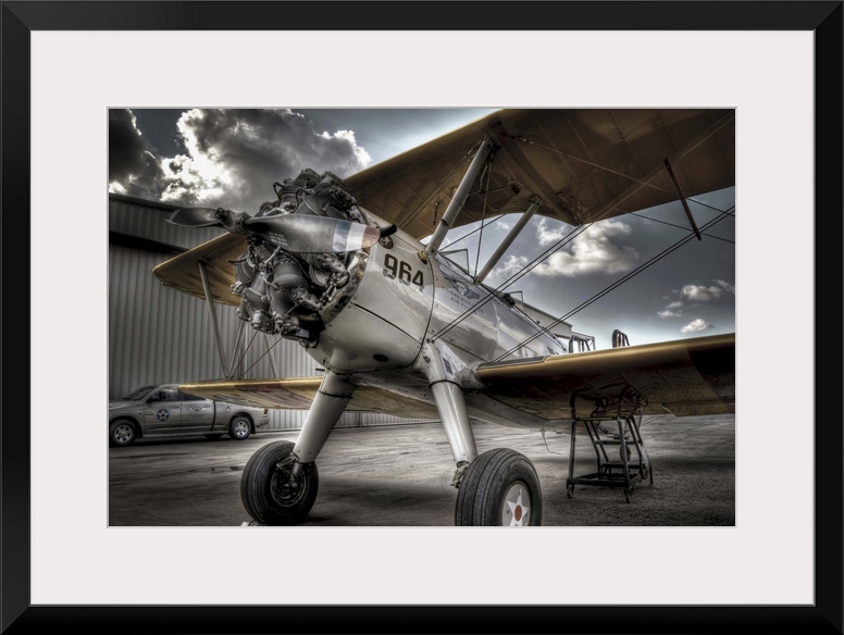 <p>A HDR photograph of a vintage air craft parked on the tarmac outside a hanger and a sky full of large cumulous clouds. The airplane is a Stearman Bi Plane found at the Arizona wing of the Commemorative Air Force Museum in Arizona</p>