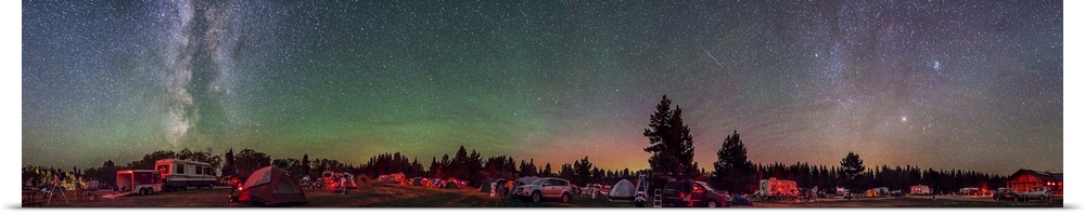 <p>August 19, 2012 - A 360 degree panorama of the main observing field at the Meadows Campground at Cypress Hills Interprovincial Park, Saskatchewan, Canada, for the annual Summer Star Party. Note the aurora and bands of airglow to the north at center. The setting and rising Milky Way are at left and right respectively.</p>