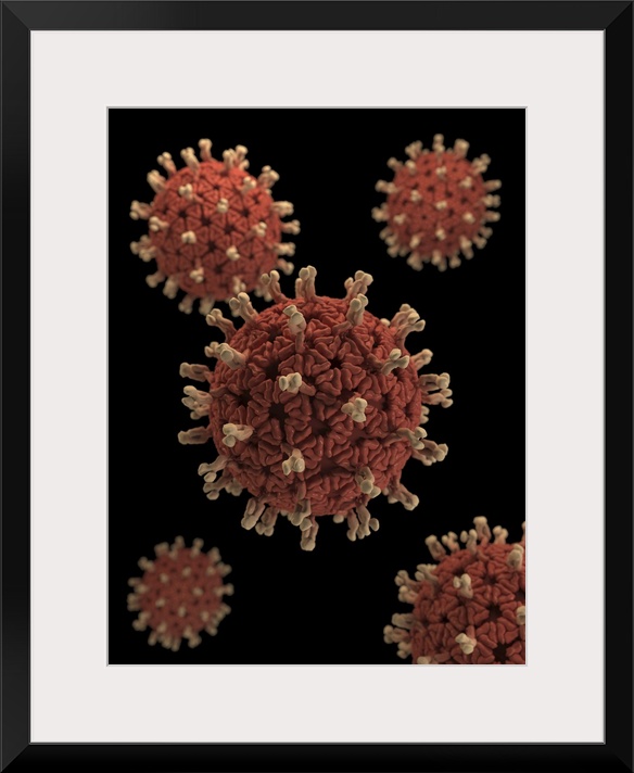 <p>A 3D representation Rotavirus virions set against a black background.</p>