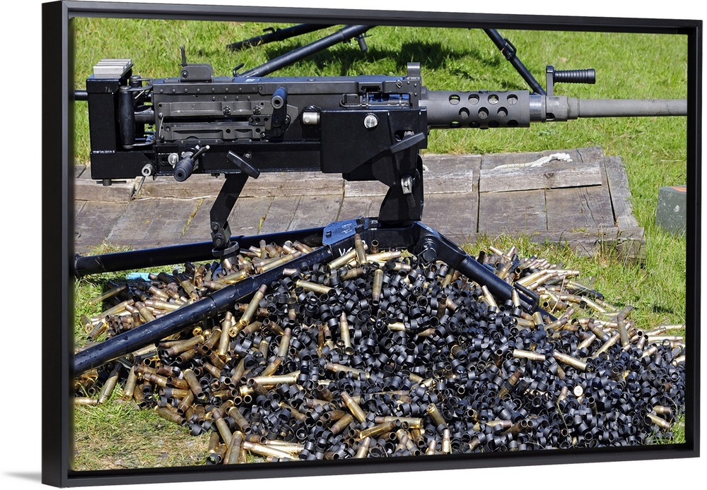 <p>Big, horizontal, close up photograph of a .50 caliber browning machine gun, sitting in the grass, over a large pile of used cases and links.</p>