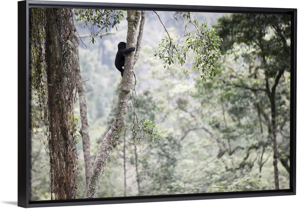 <p>A baby gorilla climbs a tall tree in the impenetrable forest, Bwindi Impenetrable National Park, Uganda</p>
