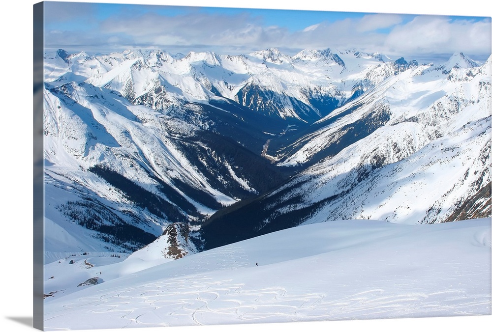 <p>A back country snowboarder descends a snow field near Roger's Pass in the Selkirk Mountains.</p>