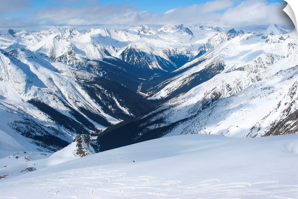 <p>A back country snowboarder descends a snow field near Roger's Pass in the Selkirk Mountains.</p>