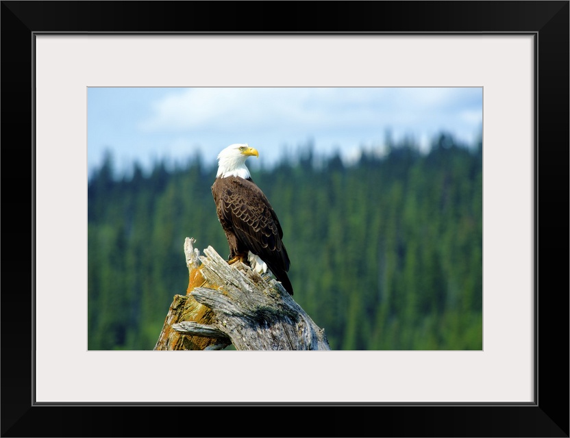 <p>A bald eagle perching on a dead tree scans the marsh of Bowron Lake in Bowron Lake Provincial Park, BC.</p>