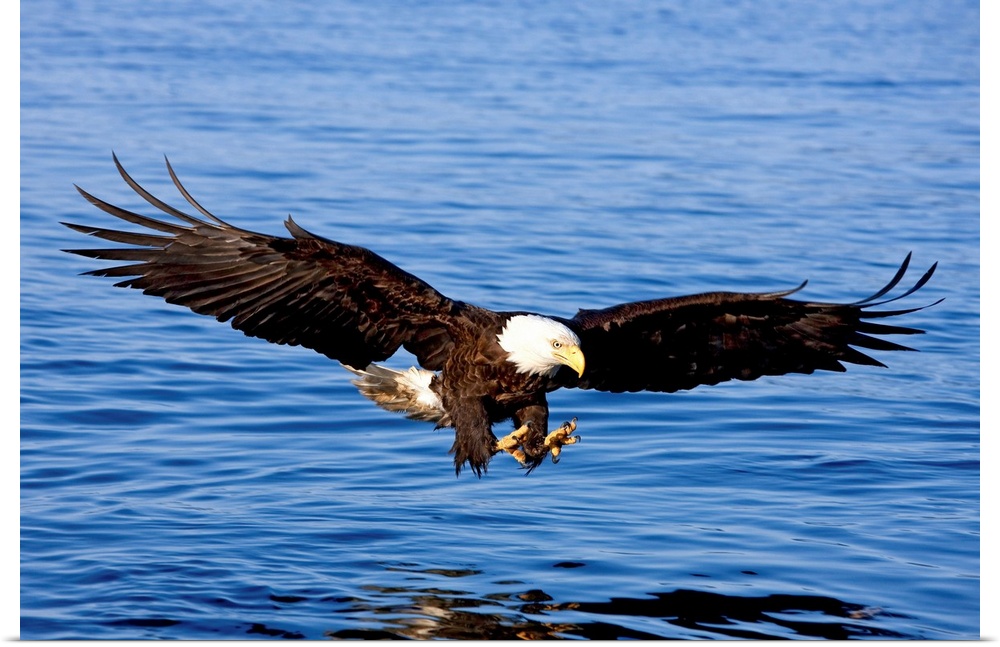<p>Landscape photograph of a bald eagle in Southeast Alaska, soaring toward the water with extended talons to catch a fish.</p>