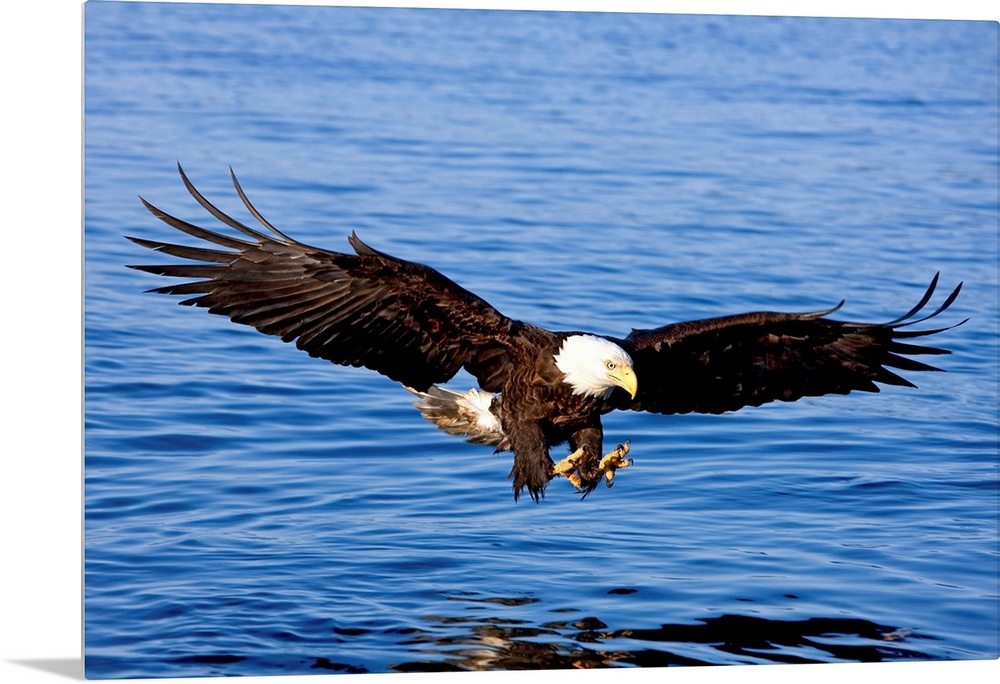 <p>Landscape photograph of a bald eagle in Southeast Alaska, soaring toward the water with extended talons to catch a fish.</p>
