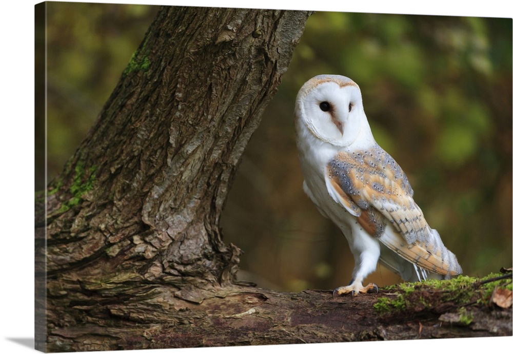 <p>A Barn Owl perched on the branch of a large tree.</p>