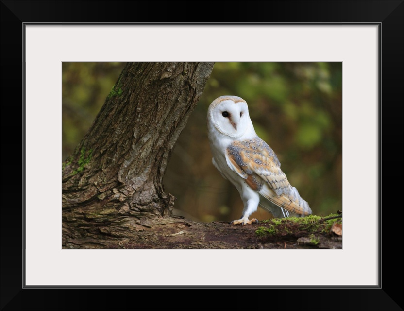 <p>A Barn Owl perched on the branch of a large tree.</p>