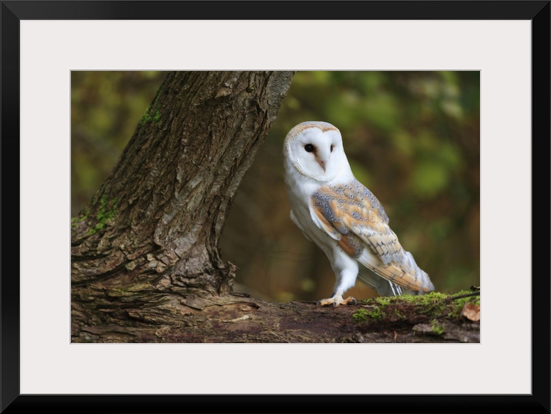 <p>A Barn Owl perched on the branch of a large tree.</p>