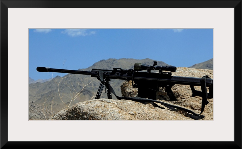 <p>Wall docor of a sniper rifle that is propped up on a stony ridge over looking mountains in Afghanistan that was used in a firefight between the Taliban and U.S. Soldiers.</p>