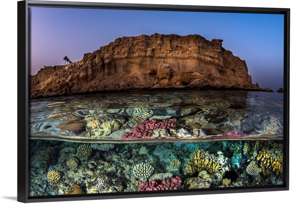 <p>A beautiful coral reef sits just under the surface of the water near a desert mountain.</p>