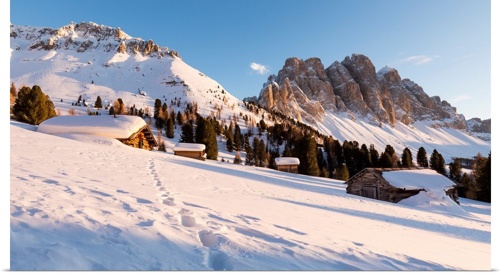 <p>A Beautiful Sunset On The Geisler In Villnoss With A Group Of Mountain Huts In The Foreground, Bolzano Province, South Tyrol, Trentino Alto Adige, Italy.</p>