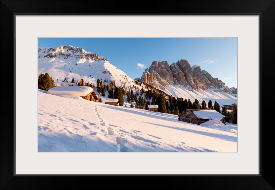 <p>A Beautiful Sunset On The Geisler In Villnoss With A Group Of Mountain Huts In The Foreground, Bolzano Province, South Tyrol, Trentino Alto Adige, Italy.</p>